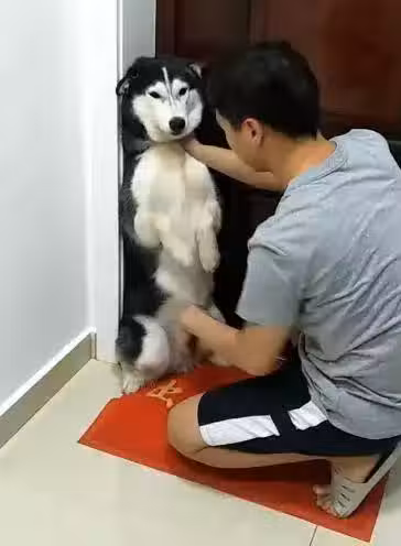 男主人看見二哈不僅沒有認識到自己的錯誤,還嬉皮笑臉就更生氣了!也不知道拿牠如何是好。