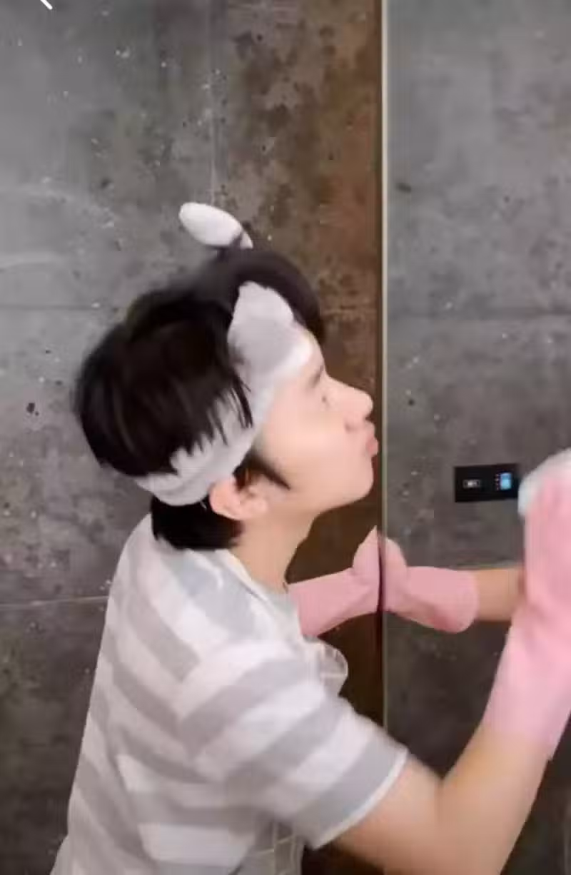 例如8月25日王祖藍曬出自己做家務的一則視頻,祝大家七夕快樂。視頻中的他頭戴兔耳朵發帶,系著圍裙在衛生間洗洗涮涮,雖然只露出了一個小角落,但還是可以看出王祖藍家的裝修十分氣派,牆壁和地板都鋪上了黑色大理石塊,而浴室和洗漱區中間還用玻璃門相隔,顯得十分低調奢華。