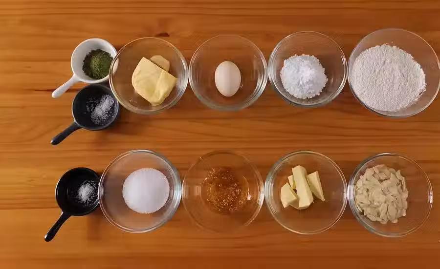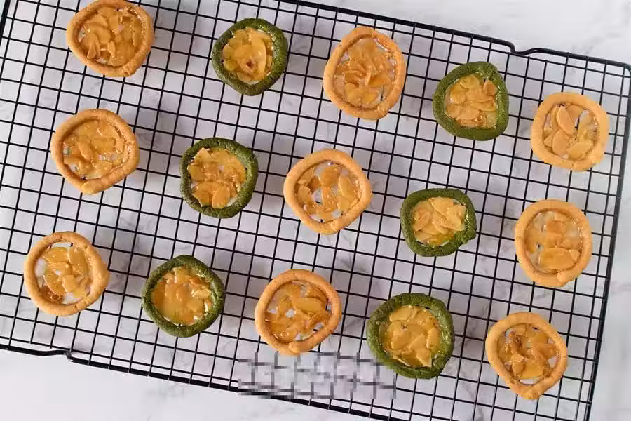 曲奇麵團:低筋麵粉115克,抹茶粉4克,糖粉36克,食鹽1克,無鹽黃油85克,全蛋液42克焦糖餡:扁桃仁片45克,麥芽糖45克,細砂糖30克,食鹽1克,無鹽黃油38克