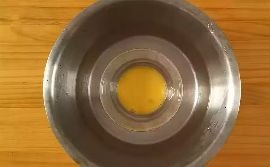 全蛋液隔50度左右溫水加熱,使其溫度升為30度左右,這樣可以避免油水分離。