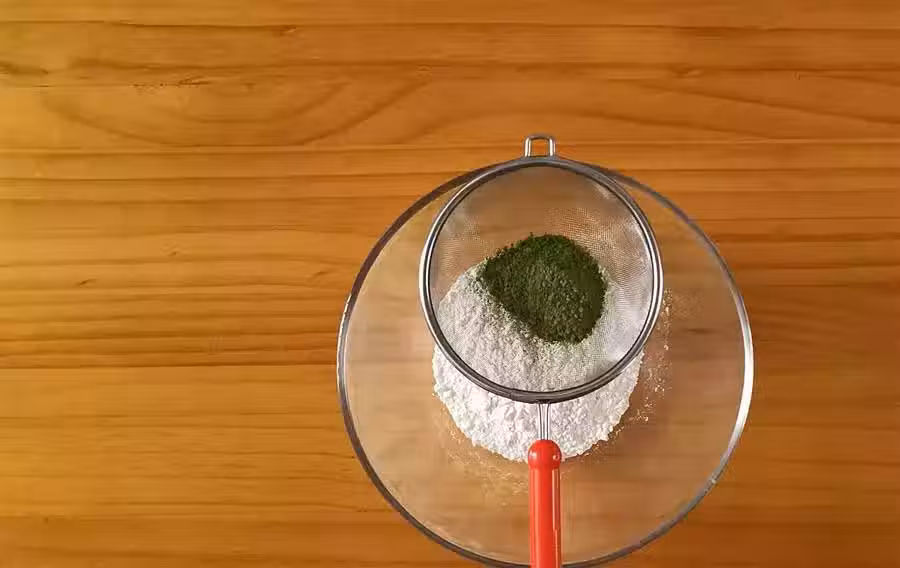 將60克低筋麵粉放置一邊備用,然後向55克低筋麵粉中過篩加入抹茶粉,用打蛋器攪拌均勻,抹茶粉的吸水率比低筋麵粉高,這裡相當於等量替換。