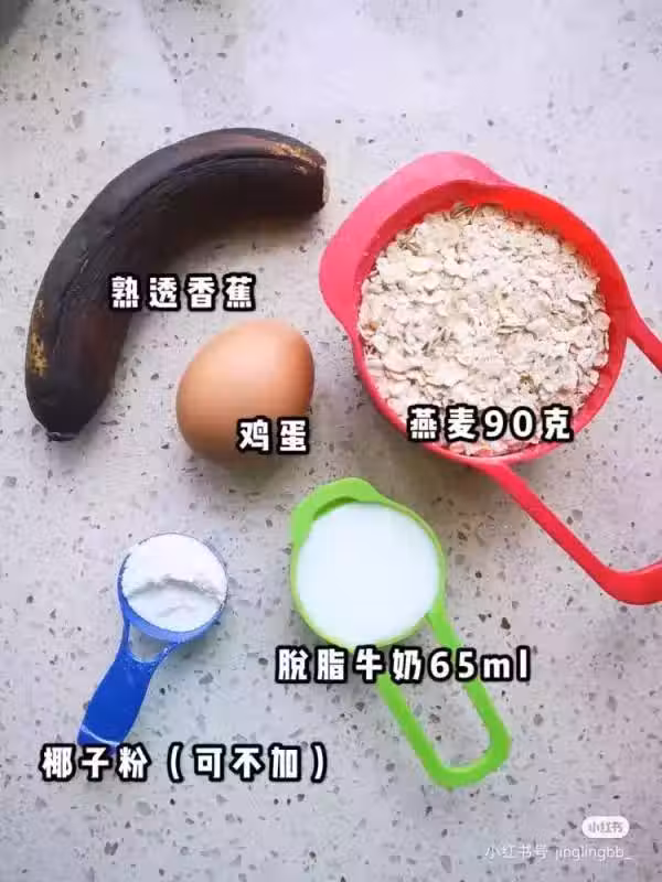 【食材】熟透香蕉一根,雞蛋一個,脫脂牛奶65ml,燕麥或者燕麥粉90克,椰子粉一小勺(這個可以不加)