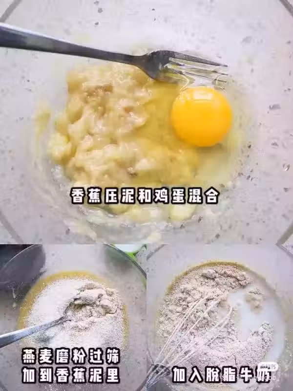 2.香蕉壓泥和雞蛋混合,把燕麥粉過篩加入泥中