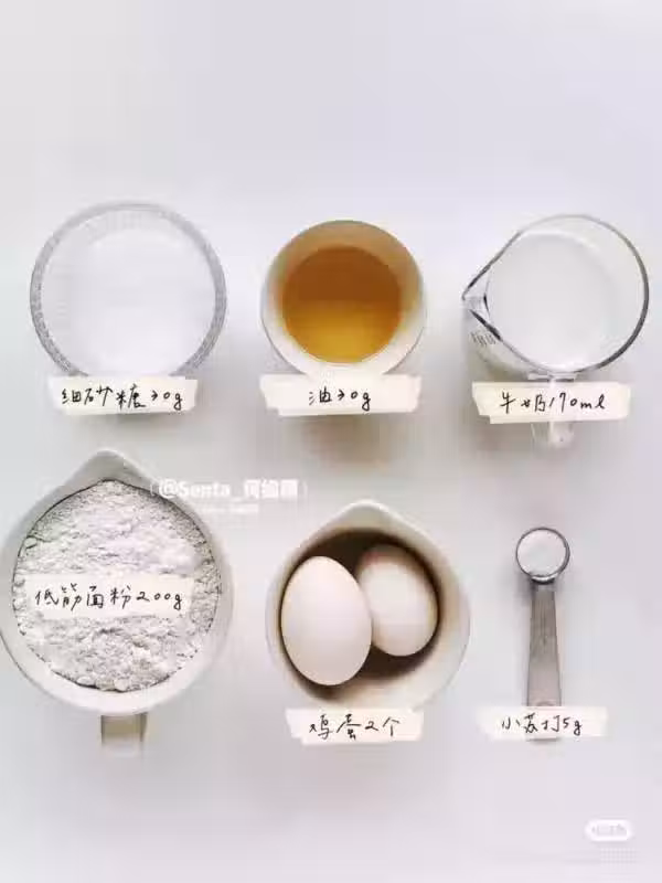 【車輪餅食材】低筋粉200g,雞蛋2個,牛奶170ml,糖30g,鹽1g,泡打粉5g,油30g