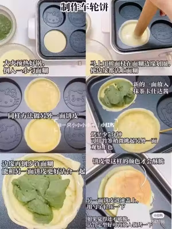 還記得你排長隊買的網紅車輪餅嗎?那HelloKitty的車輪餅你吃過嗎? 這次做的是抹茶口味車輪餅,自己做的抹茶卡仕達醬,滑圖片都有詳細材料和做法步驟哦。配方可以做5個車輪餅,下次再解鎖更多口味。