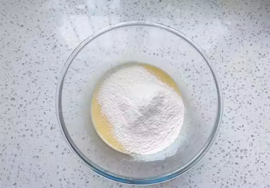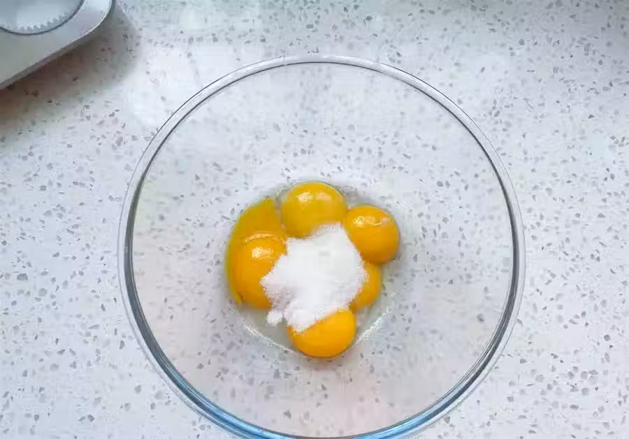 3、製作蛋黃糊:把分離的蛋黃加入細砂糖,用蛋抽攪拌至細砂糖融化。