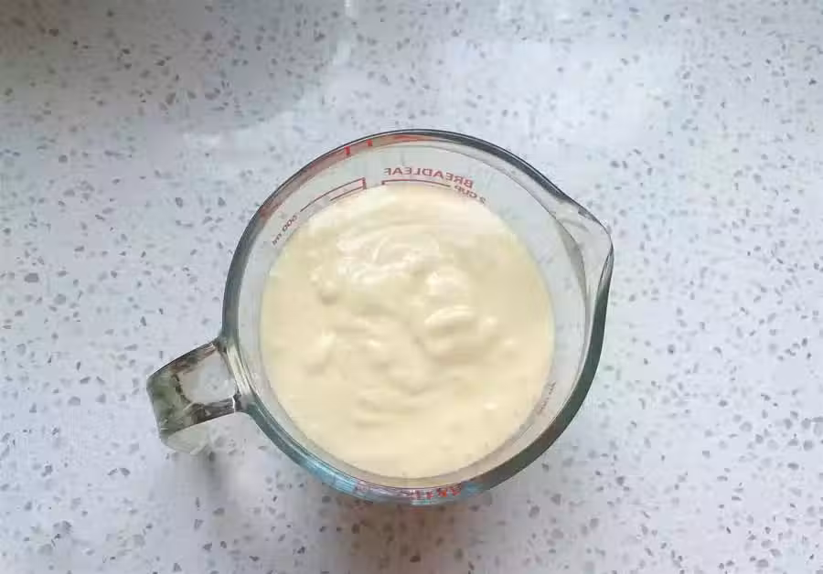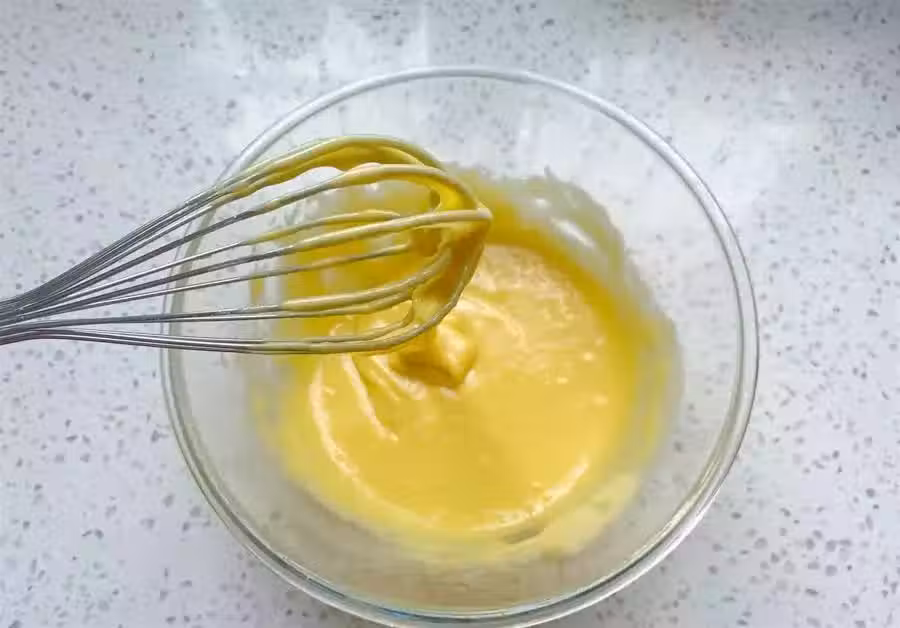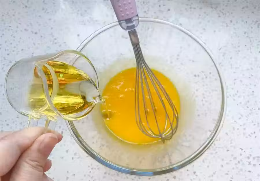4、把玉米油倒入,用蛋抽把油脂乳化,完全看不到油花為止。