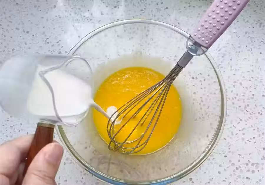 5、把牛奶倒入,用蛋抽攪拌均勻,完全融合一起。