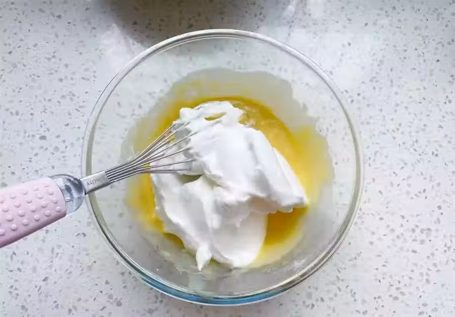 9、取三分之一蛋白霜放入蛋黃糊裡,用刮刀翻拌均勻,不要畫圈攪拌,用刮刀抄底翻拌。