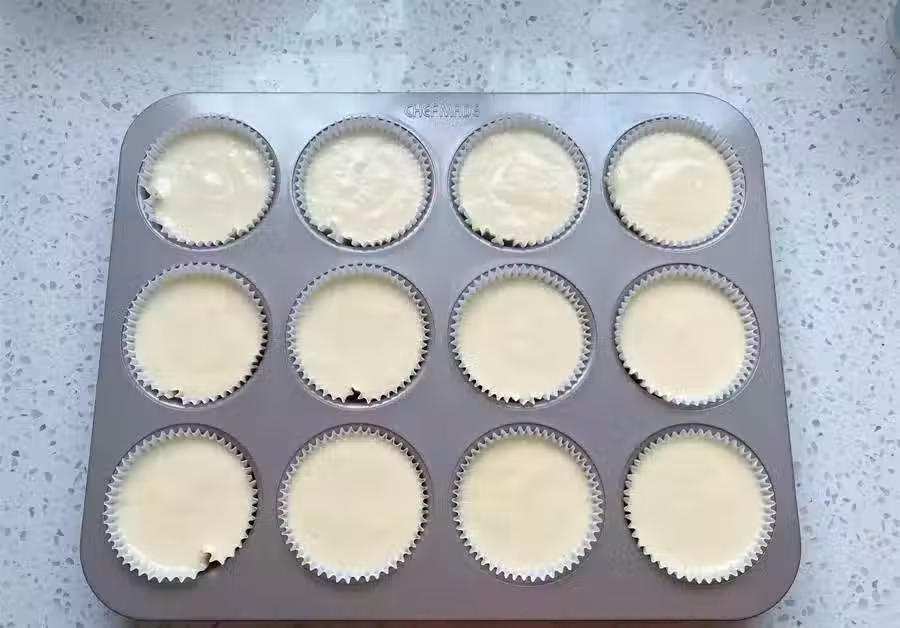 11、把蛋糕糊倒入紙托裡,九分滿,用力顛下模具,震出蛋糕糊裡的氣泡。