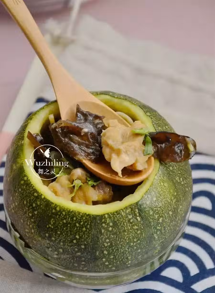 材料:小南瓜一粒 黑木耳適量 雞腿一個 蒜瓣一個 洋蔥適量