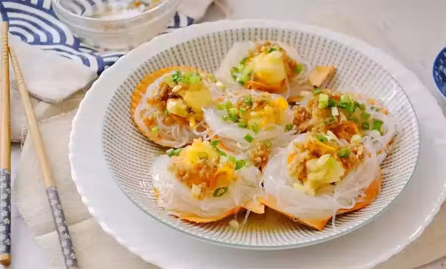 除熱油外將調料混合備用,在每個扇貝殼上碼上適量的紅薯粉絲將洗淨的扇貝放上去
