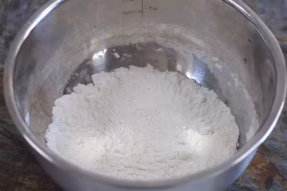3、低筋麵粉中加入無鋁泡打粉、小蘇打和鹽,攪拌均勻待用。