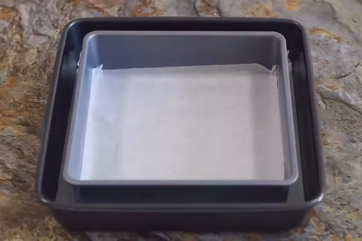 5、取比蛋糕模具的底部略大一圈的油紙,鋪好,這樣容易脫模。但是油紙不能太大,如果模具的側面有油紙,會影響蛋糕的爬高。
