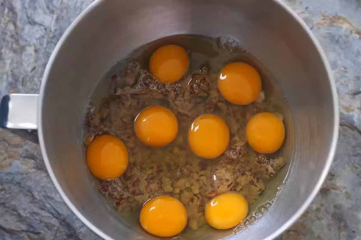 8、把雞蛋都磕進紅棗紅糖牛奶糊中。此時需要預熱烤箱了:150度,上下火,10分鐘。