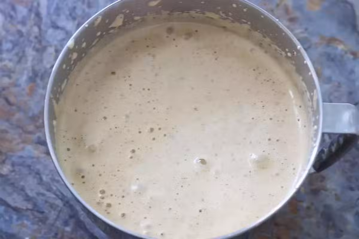 9、用電動打蛋器高速打發,直到雞蛋糊的體積漲大至2.5-3倍,此時,打蛋器在打發時,雞蛋糊會出現明顯的紋路,取出打蛋器,紋路會消失,說明打發到位。如果室溫低,就把打蛋盆入進熱水中打發(取一個更大的盆,放進熱水,然後把打蛋盆放進大盆)。