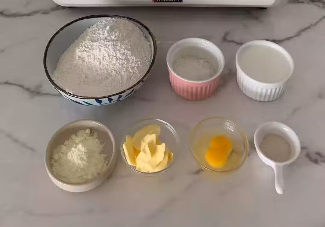 食材:高筋麵粉250克,糖40克,酵母3克,奶粉14克,鹽2克,雞蛋30克,黃油25克,牛奶135克
