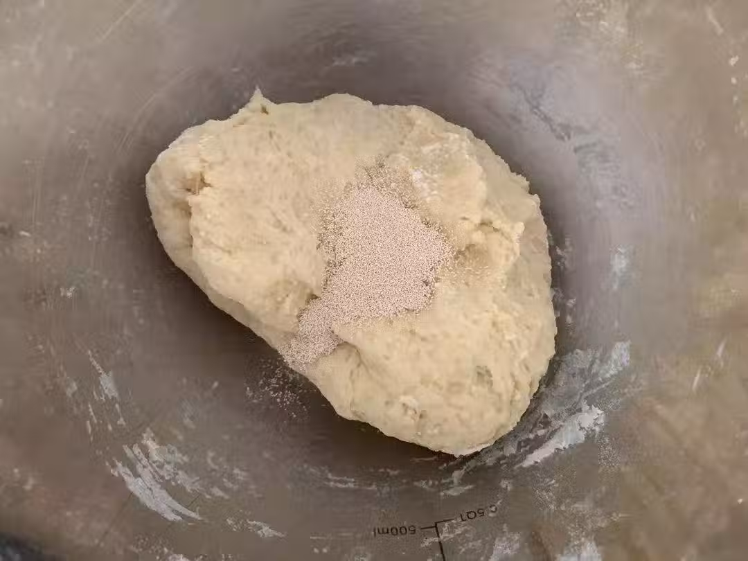 1、除了黃油和酵母,將所有的食材用筷子攪拌成絮狀,用手揉到擴展。