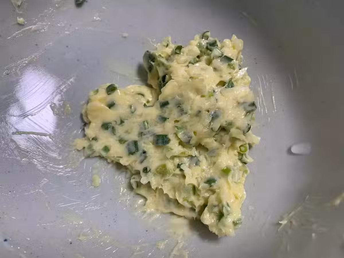 6、製作蒜蓉醬:黃油25克,蒜末12克,蔥5克,鹽1克攪拌均勻裝入裱花袋。