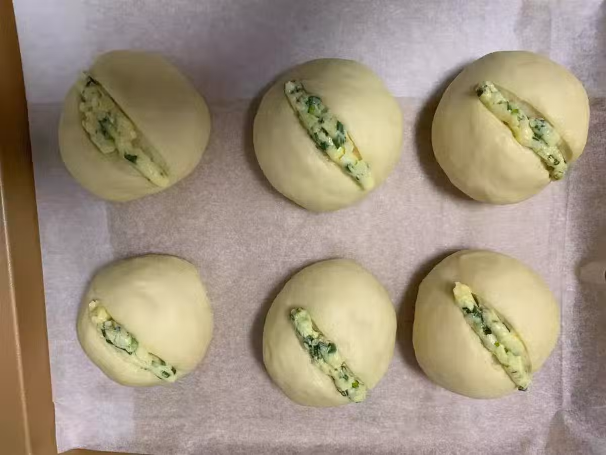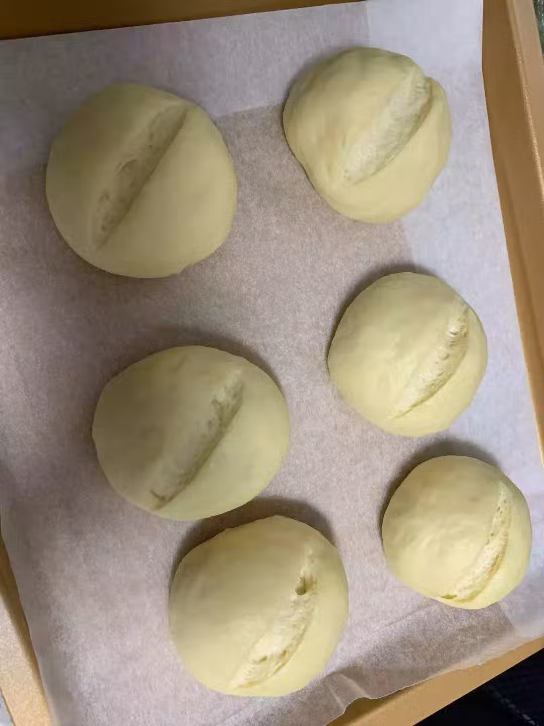 5、在案板上揉按幾下,排氣,均勻分成9份滾成圓放在烤盤,放入烤箱35度二次發酵40分鐘。