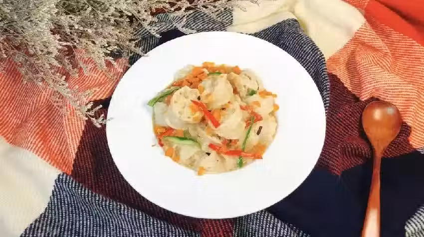 藕片用冷水提前泡發,泡軟!泡發好的藕片撈出來擠干水份備用;
