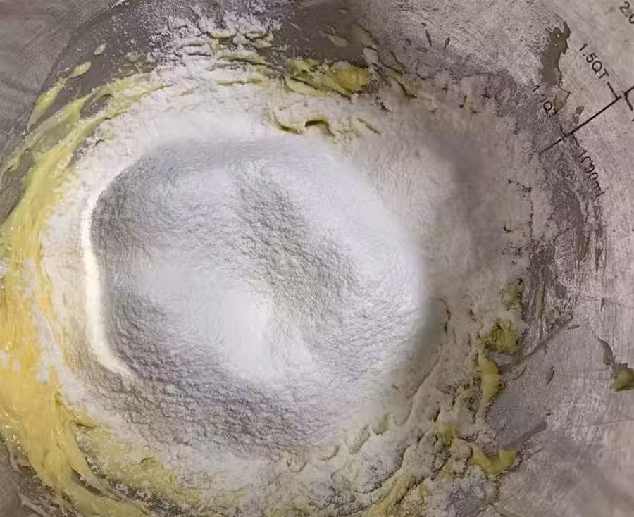 1、 首先把黃油放出室溫軟化,軟化後加入糖粉和鹽,翻拌至融合。加蛋液打至蓬鬆變白。