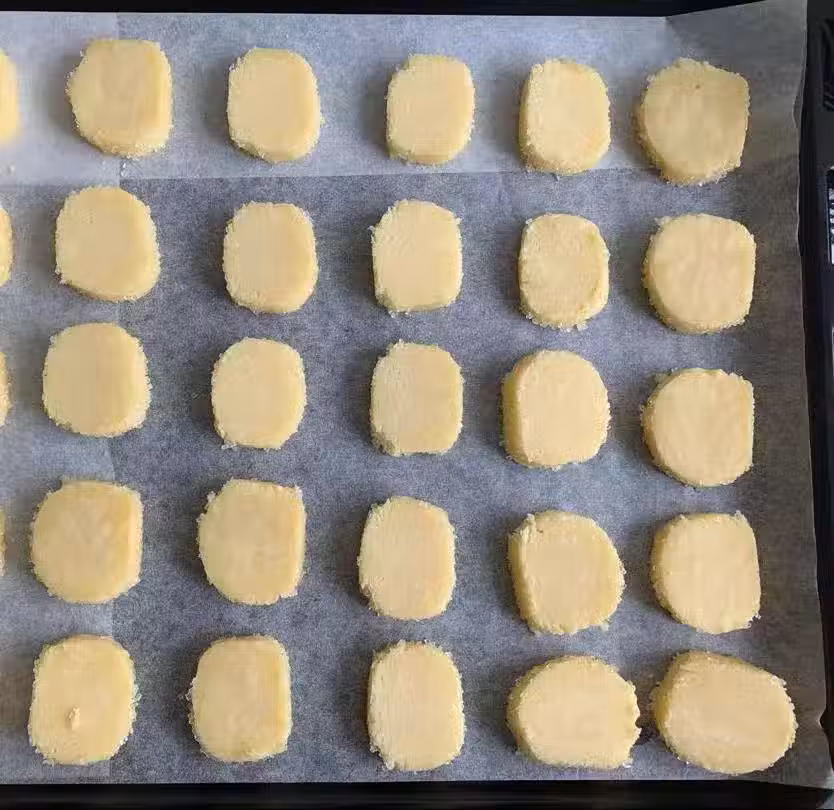 7、再把它切成片,烤盤上鋪上油紙,把餅乾擺放上去。