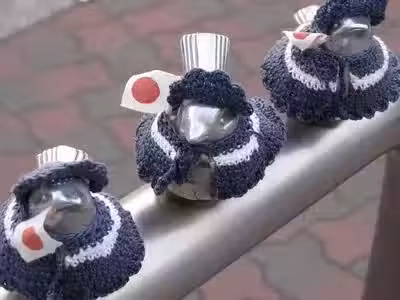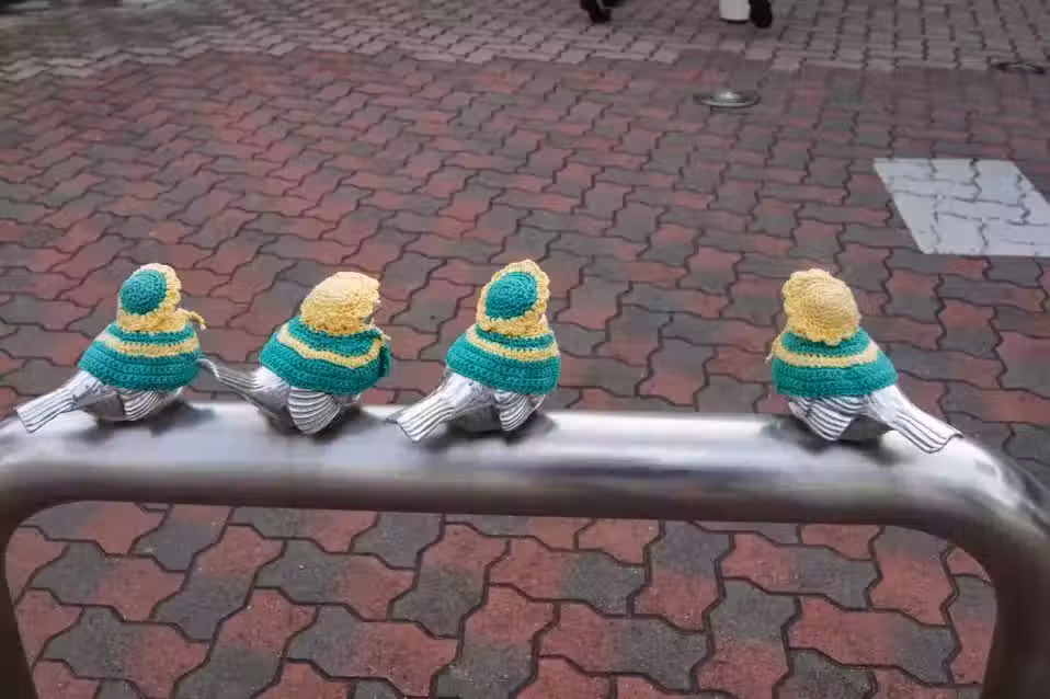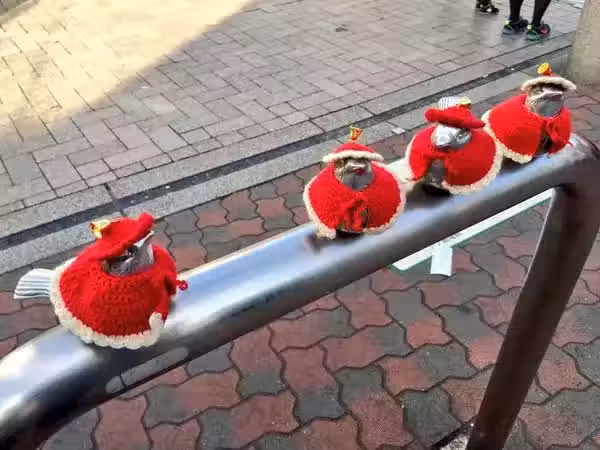最近天氣越來越冷,路上的行人紛紛開始穿上保暖的外套禦寒,在日本的江之島車站前卻出現了一幅有趣的景象:裝飾在鐵欄杆上的八隻不鏽鋼小麻雀,竟然也穿上了超迷你的手織毛衣披肩,頭上還戴著小小的毛線帽子!