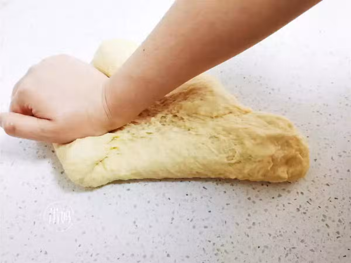 8、待主麵團發酵到2倍大,用手指沾麵粉戳洞不回彈。
