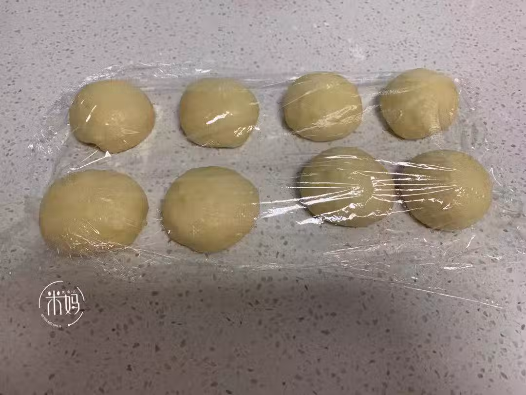 9、再對麵團進行排氣,平均分成8份,用保鮮膜蓋住,揉圓蓋保鮮膜醒15分鐘。