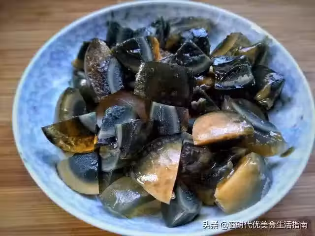 3、皮蛋剝去殼,切成小塊兒,放在一邊備用。