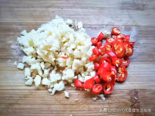 4、蒜切末,小米椒切小環。