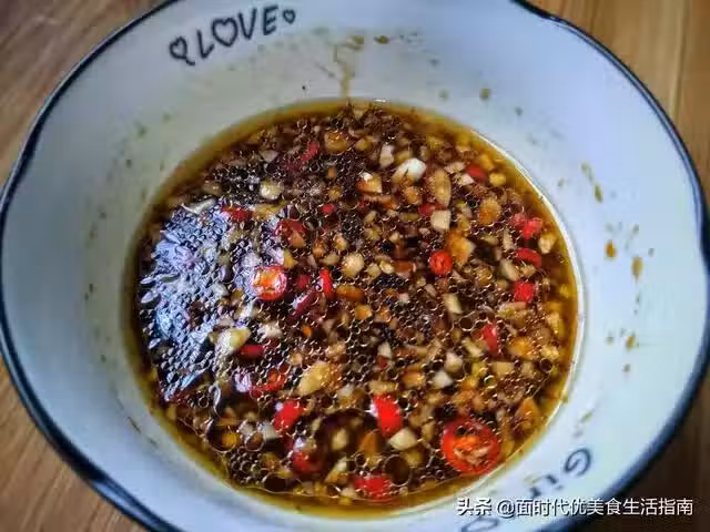 5、取一個碗,蒜末小米椒混合,加入2勺味極鮮,1勺耗油,1勺醋,1勺糖,1勺香油、拌勻。