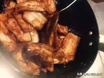 3.熱油鍋中,放入五花肉,蓋上鍋蓋,小火炸約3分鐘,呈棗紅色且呈鍋巴狀撈出控油。