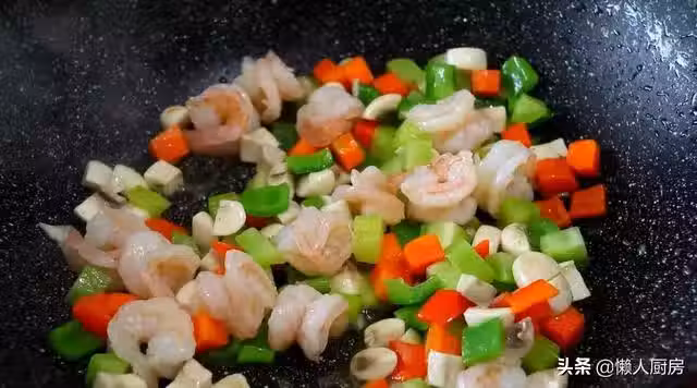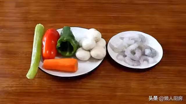 蝦仁,胡蘿蔔,蘑菇,萵筍,青椒,紅椒。