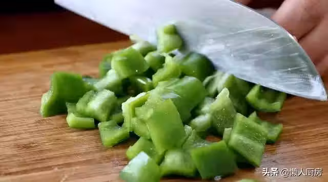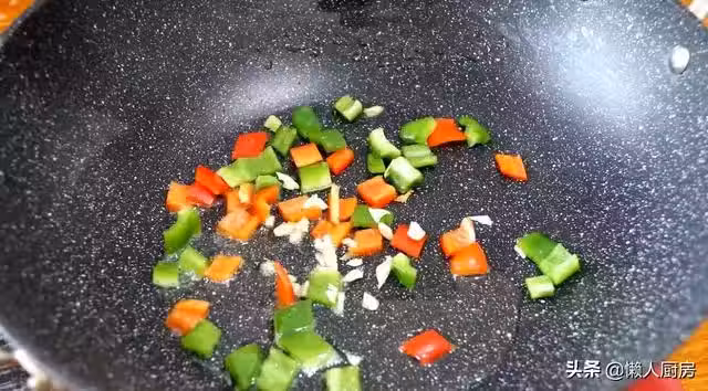 倒掉鍋內的水,將鍋燒熱,往鍋內倒一點油,下青紅椒,炒至青紅椒丁斷生,加一點點蒜末。