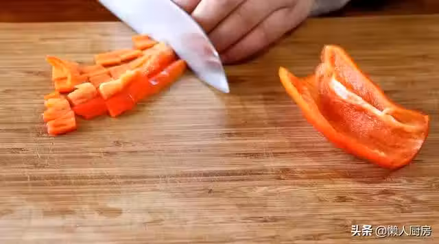 將胡蘿蔔切成小丁,蘑菇切小丁,萵筍切小丁,青椒切小丁,紅椒切小丁。