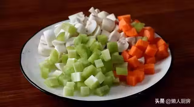 鍋內燒水,等到水開後放入胡蘿蔔丁、蘑菇丁、萵筍丁焯水,撈出瀝水。