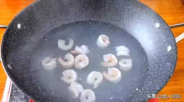 將處理好的大蝦也倒入鍋內焯一下水,隨後撈出瀝水。