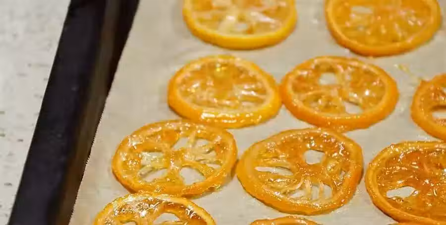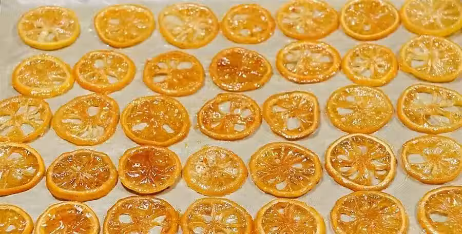 烤盤內鋪上一層油紙,將煮好的檸檬片放在烤盤內,入烤箱,用100度上下火烤1到1.5小時的時間,烤好後出爐,一道即食檸檬片就做好了。