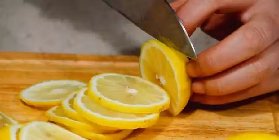 把洗淨的檸檬切成片狀,摳掉裡面的檸檬籽。
