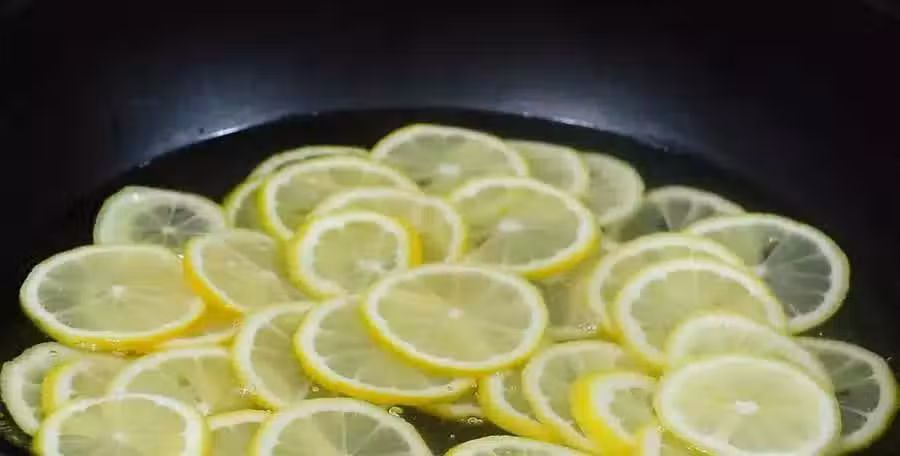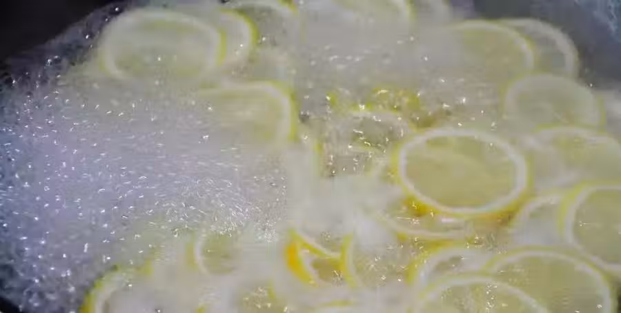 鍋內倒水,水燒開後放入檸檬片焯水,焯上1分鐘就可以撈出檸檬了,這步焯水可以減輕檸檬的苦味。