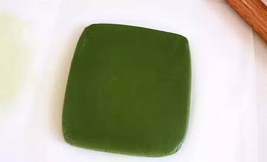 8,將抹茶麵團用同樣的方法整理成方形,再用油紙包裹起來放在冰箱裡冷藏定型。