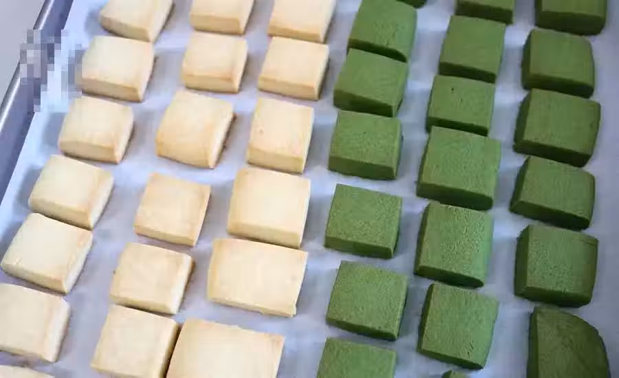 7,另外我還做了抹茶味的。70克軟化的黃油加10克白糖和1克鹽攪打均勻,再加入55克煉乳攪打均勻,然後篩入145克低筋麵粉和5克抹茶粉,揉成麵團。