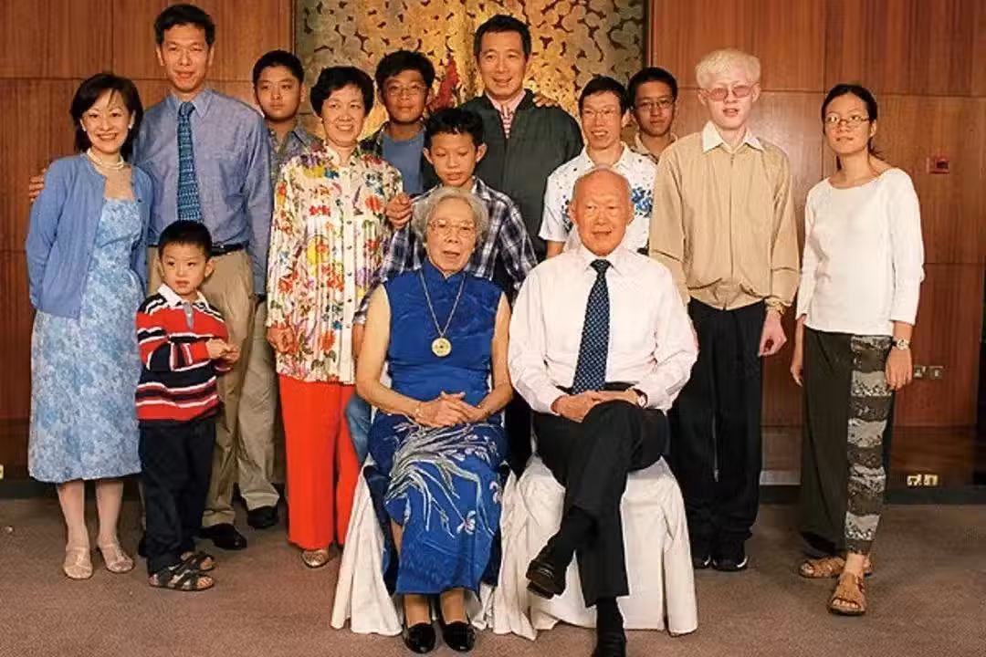 早期拍攝的全家福。第一排為李光耀夫婦,後排左二為李顯揚、右四為李瑋玲、右五為李顯龍。