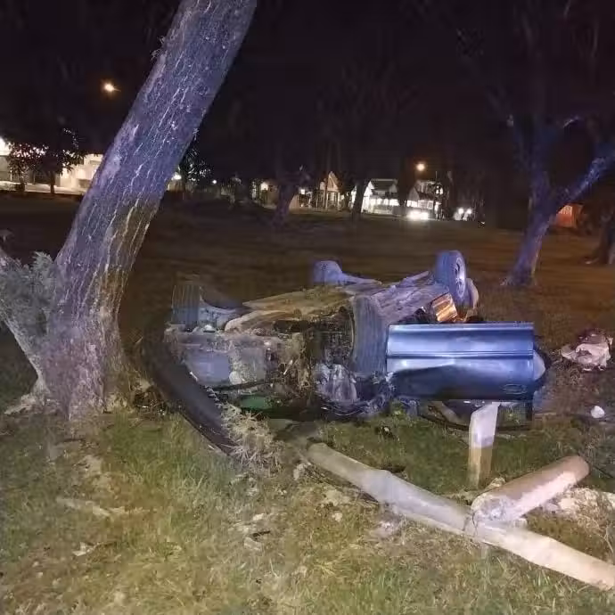 轎車猛撞樹後翻覆,車身毀壞不堪。