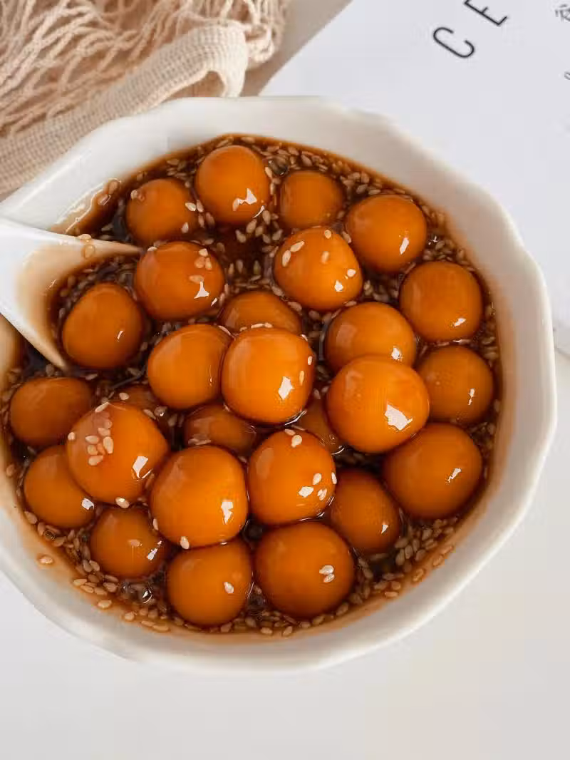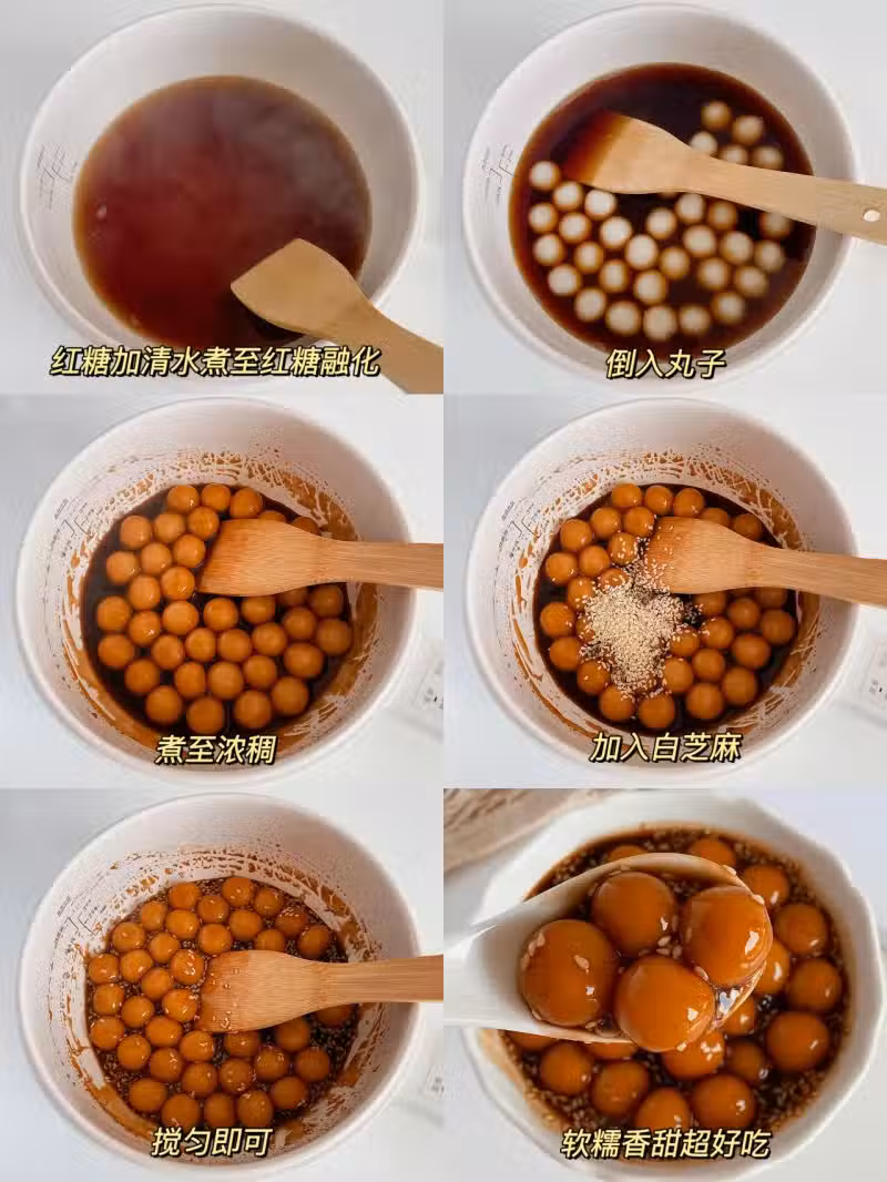 3️⃣紅糖+清水煮至紅糖融化,倒入丸子煮至濃稠,加入芝麻攪勻即可
