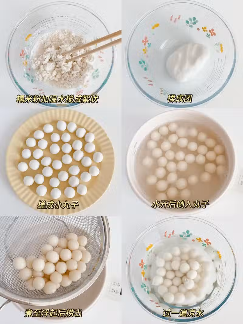1️⃣糯米粉+溫水用筷子攪成絮狀,揉成麵糰,搓成小丸子