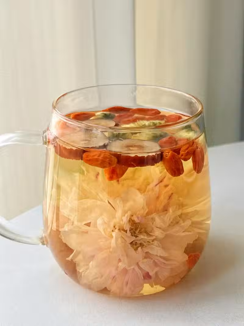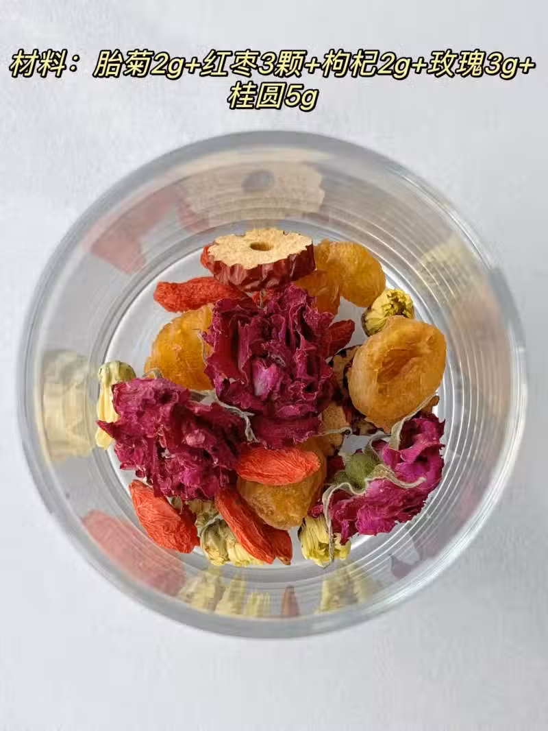 材料:胎菊2g+紅棗3顆+枸杞2g+玫瑰3g+桂圓5g