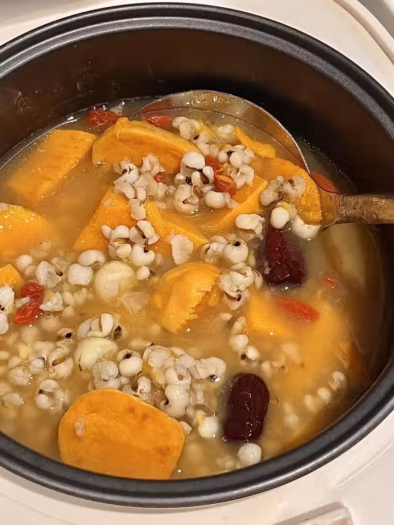 紅薯薏米蓮子湯!所有女孩子夏天要多多喝這個!!紅薯和薏米都屬於甘味食物!對女孩子很友好~祛濕健脾!利水消腫!!紅薯粉糯軟爛和薏米糯糯的搭配一起特別好喝,口感清甜而不膩!!放冰箱冷藏一下冰冰涼涼的巨清爽!!